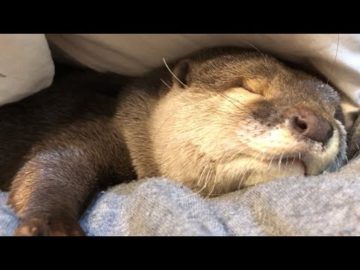 カワウソさくら 昼寝しているとやっぱり無理やりにでも割り込む Otter sleeping between owner’s arms