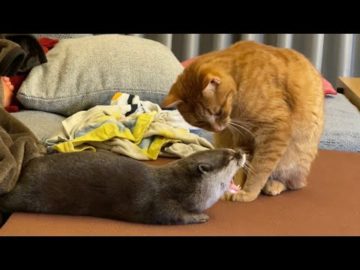カワウソさくら 匂いの強い液体を嗅いだカワウソと猫の反応の違いが面白い Otter and cat sniffing