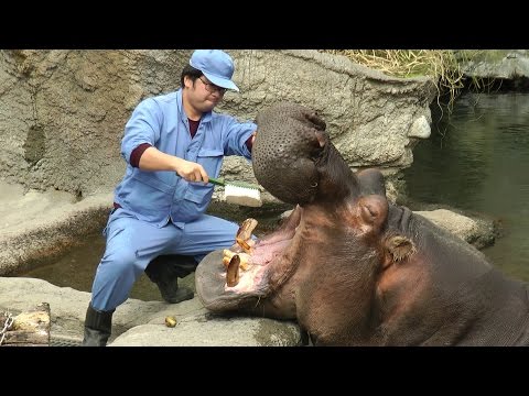 カバの歯磨き~そしてお食事の時間(陸上&水中)天王寺動物園 Brushing the Hippo’s Teeth and meal time at Tennoji Zoo