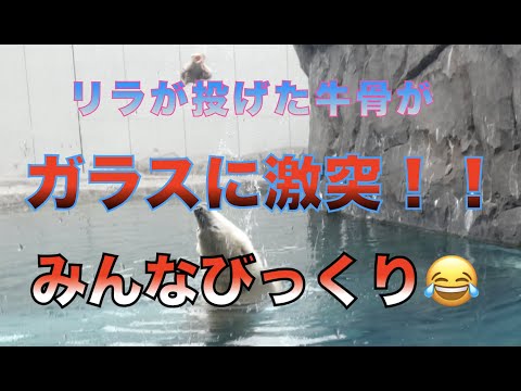 【円山動物園シロクマ】リラが投げた牛骨がガラスに激突!!みんなびっくり😂